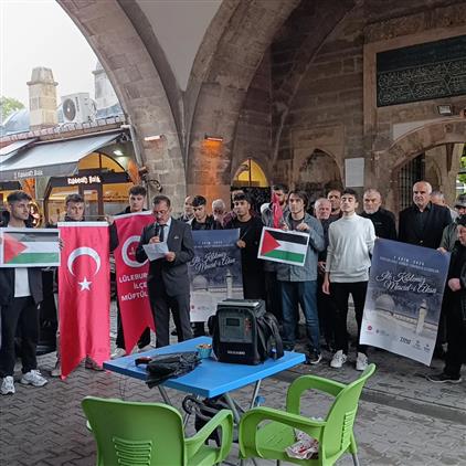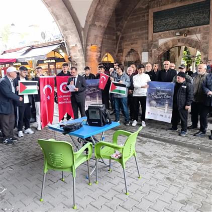 Lüleburgaz Mehmet Eşref Efendi Erkek öğrenci yurdu manevi danışmanı Ahmet Cemal KAHVECİ tarafından basın açıklaması yapıldı. Salı günü ikindi namazı akabinde Tarihî Sokullu Mehmet Paşa Camii Dua kubbesi altından yapılan basın açıklamasına üniversiteli öğrenci kardeşlerimiz ve cami cemaatimiz katıldı. Din Hizmetleri Uzmanı Resül ÇAY dua yapması sonucu program sona erdi. İnsanlık meselesi olan Gazze mazlumları ve ilk kıblemiz Mescid-i Aksanın özgürlüğüne kavuşması için cuma akşam namazından sonra yürüyüş yapılacağı duyuruldu.