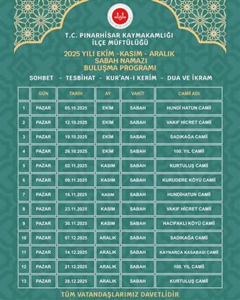 2025 YILI EKİM-KASIM-ARALIK SABAH NAMAZI BULUŞMA PROGRAMI