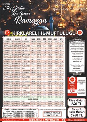 KIRKLARELİ İL MÜFTÜLÜĞÜ RAMAZAN İMSAKİYESİ 2026